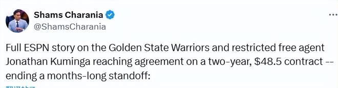 北京时间10月1日,名记Shams报道称,受限制自由球员乔纳森-库明加已同意以两年4850万美元的合同回到勇士队,Verus篮球经纪公司的经纪人亚伦-特纳告诉ESPN。消息人士称,这笔交易在第二年包含球队选项,这是为勇士队设计的——或者如果库明加在即将到来的赛季中被交易,另一支球队也可以在2025-2026赛季后终止合同并签订一份全新的合同。