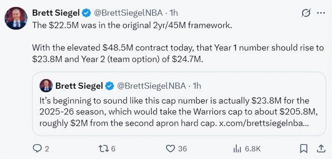 原本库明加跟勇士的合同是两年4500万,最终谈到两年4850万,这份合同是1+1(包含球队选项、库明加放弃交易否决权)。起薪也从2250万上浮到2380万,第二年的薪水为2470万。